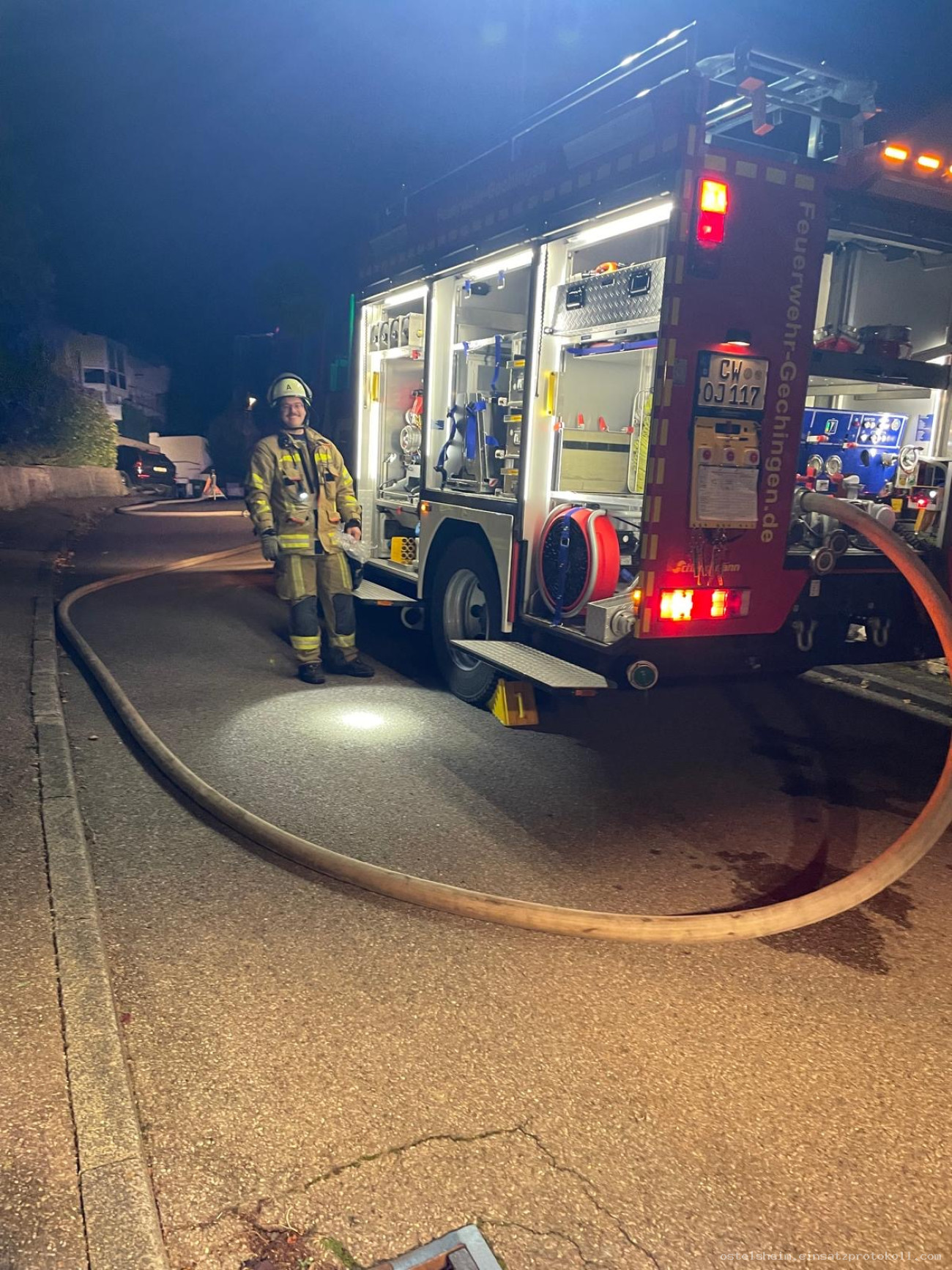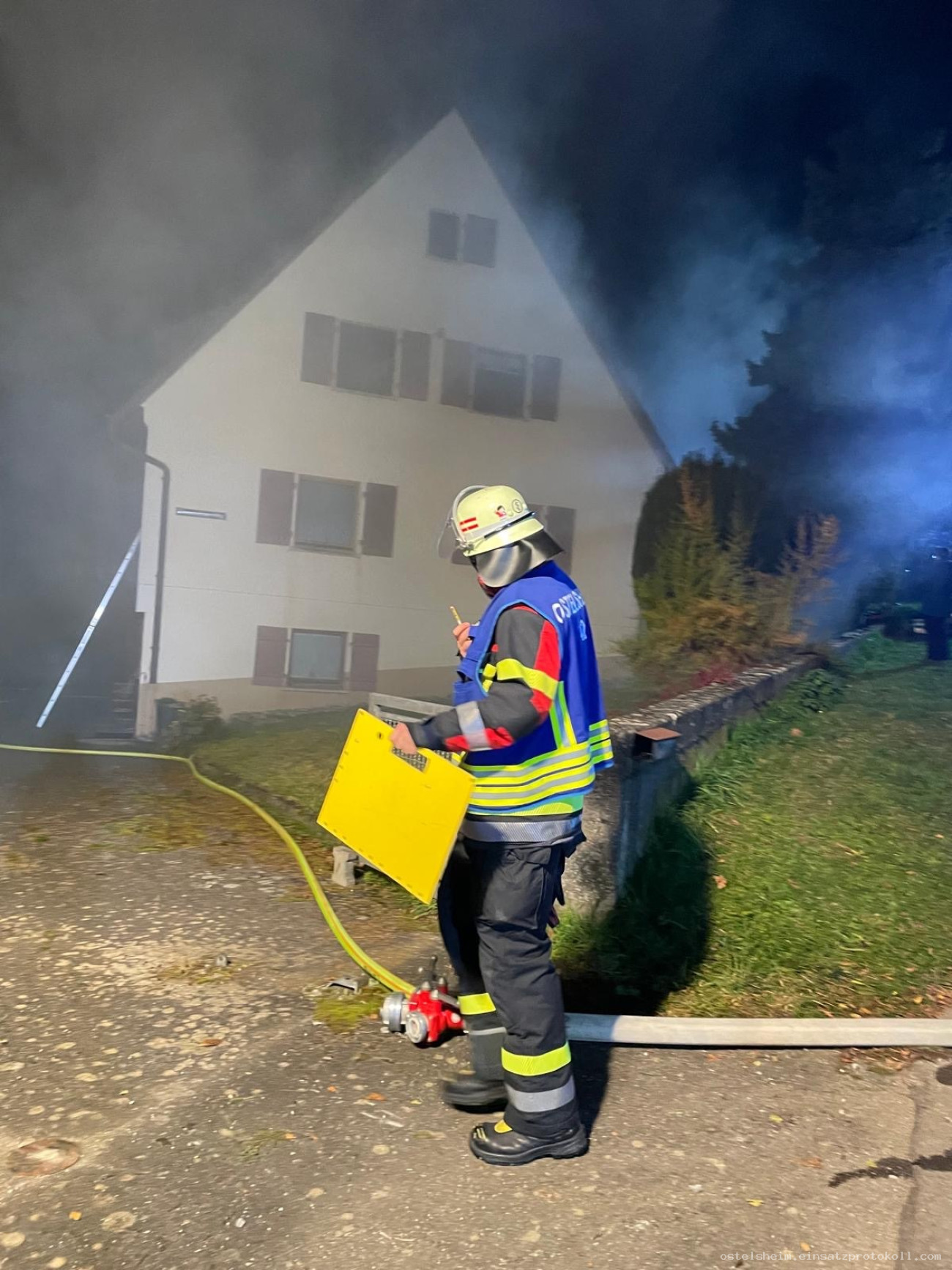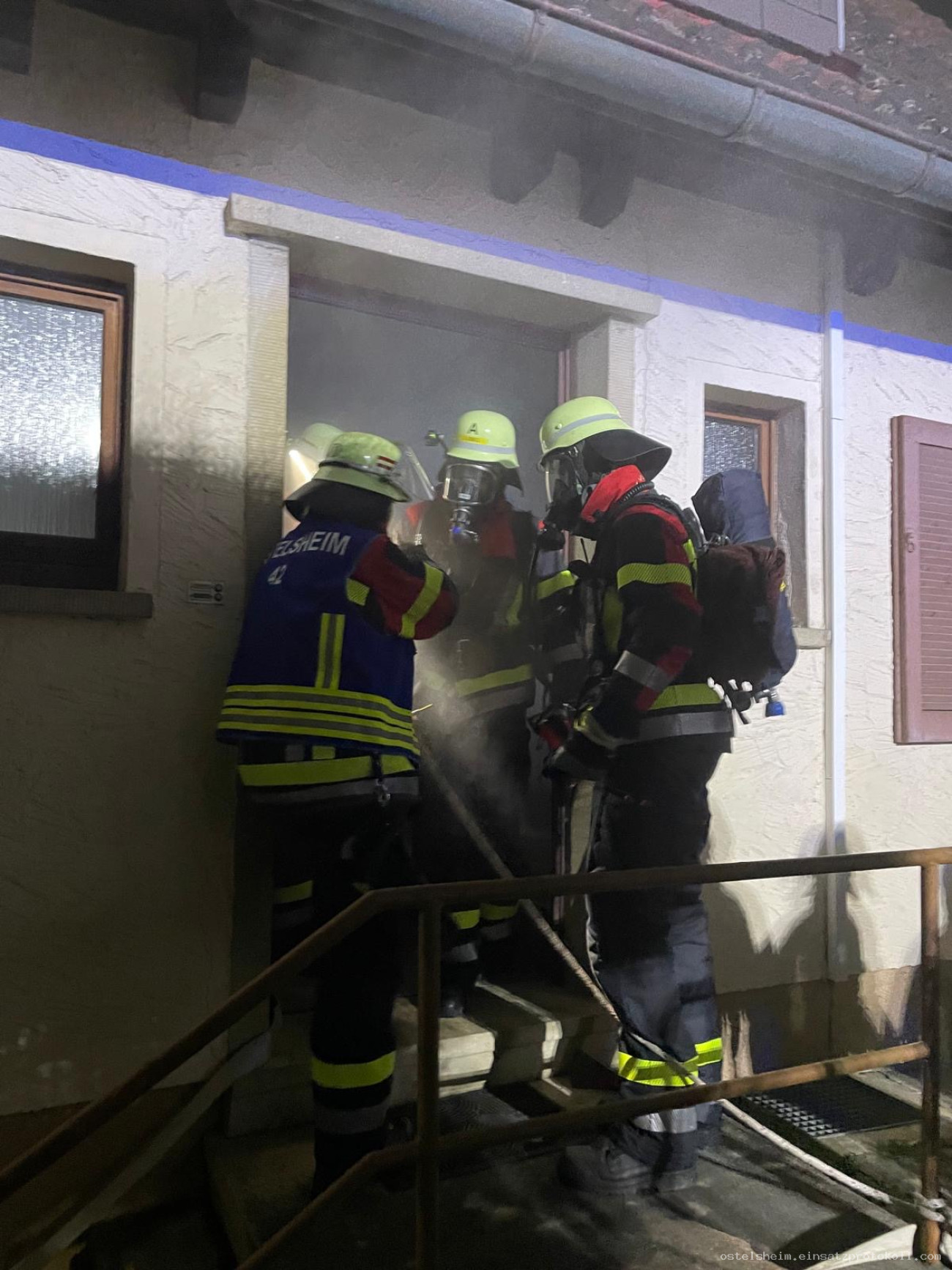 Das ersteintreffende Fahrzeug der Feuerwehr Ostelsheim begann sofort mit einem Löschangriff, um ein Übergreifen des Feuers auf das Wohnhaus zu verhindern. Bei der Erkundung wurden auf der Gebäuderückseite mehrere Personen an einem Fenster entdeckt. Diese waren zwar nicht unmittelbar bedroht, konnten sich jedoch aufgrund der starken Verrauchung im Treppenraum nicht selbst in Sicherheit bringen. Die nachrückenden Kräfte aus Gechingen sowie die Mannschaft des LF 8/6 aus Ostelsheim wurden durch den Einsatzleiter mit der Rettung der Personen beauftragt. Zwei Trupps unter Atemschutz suchten das komplette Wohnhaus nach weiteren Personen ab und brachten diese ins Freie. Außerdem wurde über den Garten des Wohnhauses ein weiterer Löschangriff auf der Rückseite der Garage aufgebaut. Insgesamt konnten fünf Personen aus dem Gebäude gerettet werden.
